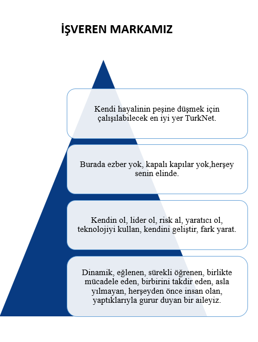 “Kendi hayalinin peşine düşmek için çalışılabilecek en iyi yer Turknet. Burada ezber yok, kapalı kapılar yok, herşey senin elinde. Kendin ol, lider ol, risk al, yaratıcı ol, teknolojiyi kullan, kendisni geliştir, fark yarat. Dinamik, eğlenen, sürekli öğrenen, birlikte mücadele eden, birbirini takdir eden, asla yılmayan, herşeyden önce insan olan, yaptıklarıyla gurur duyan bir aileyiz.”